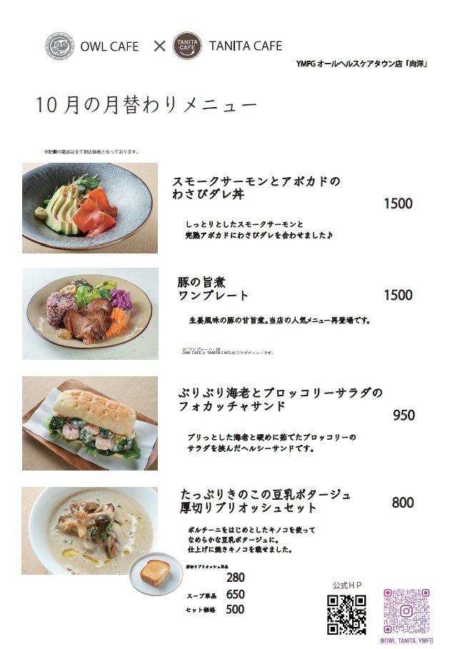 オールカフェ×タニタカフェYMFGオールヘルスケアタウン店より「10月の月替りメニュー」のご案内